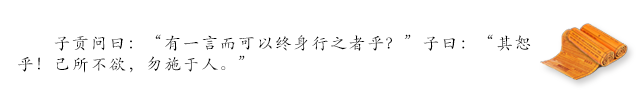 子贡问道:“有没有可以终身奉行的一个字呢?”孔子说:“那大概就是‘恕’字吧!自己不喜欢的事物,不要强行加于别人身上。”