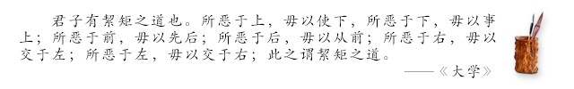 如果厌恶上司对你的某种行为,就不要用这种行为去对待你的下属;如果厌恶下属对你的某种行为,就不要用这种行为去对待你的上司;如果厌恶在你前面的人对你的某种行为,就不要用这种行为去对待在你后面的人;如果厌恶在你后面的人对你的某种行为,就不要用这种行为去对待在你前面的人;如果厌恶在你右边的人对你的某种行为,就不要用这种行为去对待在你左边的人;如果厌恶在你左边的人对你的某种行为,就不要用这种行为去对待在你右边的人。这就叫做“絜矩之道”。