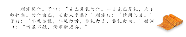颜渊问怎样做才是仁。孔子说:“克制自己,一切都照着礼的要求去做,这就是仁。一旦这样做了,天下的一切就都归于仁了。实行仁德,完全在于自己,难道还在于别人吗?”颜渊说:“请问实行仁的条目。”孔子说:“不合于礼的不要看,不合于礼的不要听,不合于礼的不要说,不合于礼的不要做。”颜渊说:“我虽然愚笨,也要照您的这些话去做。”