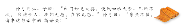 仲弓问孔子如何处世才能合乎仁道?孔子回答道:“出门与同仁行礼如见贵客一般,对民如大祭一样凝重,自己不喜欢的事不要强加给别人。如此在朝上就不会招谁怨,在家中私下的交往也不招谁恨。”仲弓感谢道:“我虽迟钝,但一定要牢记先生的话。”