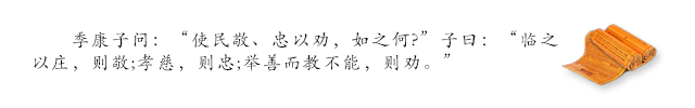 季康子问道:“要使老百姓对当政的人尊敬、尽忠而努力干活,该怎样去做呢?”孔子说:“你用庄重的态度对待老百姓,他们就会尊敬你;你对父母孝顺、对子弟慈祥,百姓就会尽忠于你;你选用善良的人,又教育能力差的人,百姓就会互相勉励,加倍努力了。”