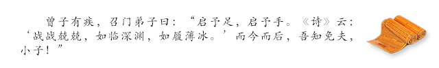 曾子生病,把他的弟子召集过来,说道:“看看我的脚!看看我的手!《诗》上说:战兢兢,好像面临着深渊,好像走在薄薄的冰层上。以今以后,我才知道自己可以免于祸害刑戮了!学生们!”