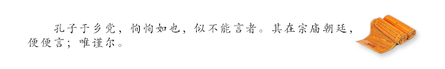孔子在家乡时,非常恭顺,好像不太会说话的样子。他在宗庙和朝廷里,说话明白而流畅,只是说得很谨慎。