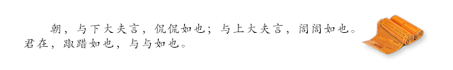 上朝的时候,(孔子)跟下大夫谈话,显得温和而快乐;跟上大夫谈话时,显得正直而恭敬。君主临朝时,他显得恭敬而不安,走起路来却又安祥适度。
