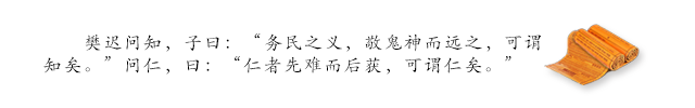 樊迟问怎么样才算聪明,孔子说:“努力从事人民认为合理的工作,尊敬鬼神,但要疏远它们,这样可以称得上是聪明了。”樊迟又问:“怎么样才叫作有仁德?”孔子说:“有仁德的人先付出艰苦的努力,然后得到收获,这样可以说是有仁德了。”
