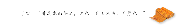 孔子说:“祭祀不该自己祭祀的鬼神,那是献媚;见到合乎正义的事而不做,那是没有勇气。”