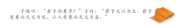 子路说:“君子崇尚勇敢吗?”孔子说:“君子把义看作是最尊贵的。君子有勇无义就会作乱,小人有勇无义就会去做盗賊。”