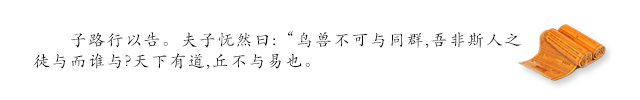 孔子失望地说:“人不能和鸟兽同群,我们不同人打交道同谁打交道?如果天下太平,我就用不着同你们一道来从事改革了。”