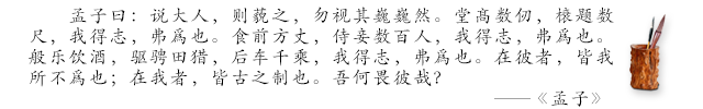 孟子说:“向位高显贵的人说话,要藐视他,不要把他的显赫地位和权势放在眼里。哪怕他殿堂高两三丈,屋檐好几尺宽,如果我得志,并不屑于这些;哪怕他佳肴满桌,侍奉的姬妾好几百, 如果我得志,并不屑于这些;哪怕他饮酒作乐,驰驱打猎,随从 车辆成百上千,如果我得志,并不屑于这些。他所拥有的,都是 我不屑于有的;我所希望的,是古代的礼乐制度。我为什么要怕他呢?”