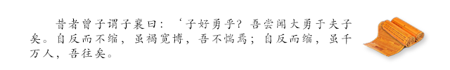 曾子对子襄说:‘你喜欢勇敢吗?我曾经在孔子那里听到过关于大勇的道理:反省自己觉得理亏,那么即使对普通百姓,我难道就不害怕吗?反省自己觉得理直,纵然面对千万人,我也勇往直前。