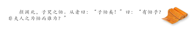 颜渊死了。孔子为他哭丧,非常悲伤。跟随的人说:“先生悲伤得过度了。”孔子说:“是悲伤过度了吗?不为这样的人悲痛欲绝,还为谁呢?”