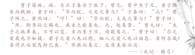 曾子卧病不起,病情严重。乐正子春坐在床的下首,曾元、曾申坐在曾子脚边,一个少年童仆手执烛火坐在墙角。童仆说:“又华丽,又光亮,这是大夫用的竹席吧?”子春说:“住嘴!”曾子听到他们的话,显出吃惊的样子说:“哎呀!”那童仆却又说了一句:“又华丽,又光亮,这是大夫用的竹席吧?”曾子说:“是啊!这是季孙赏赐的,我因病没能将它换下来。元,扶起我来,换去这张席子。”曾元说:“您已经病危了,不可以挪动身子。希望能等到天明,再请让我们为您换去席子。”曾子说:“你对我的爱护,还不如这位童仆。君子爱护人,就用德行来要求他;小人爱护人,只是让他获得一时的安逸。我还会有什么要求呢?我只有能合乎礼制地死去,心里才满足啊!”于是,曾子被扶下床,大夫用的竹席被撤换下来。曾子又被扶回换过的席子上,还没躺好就死了。