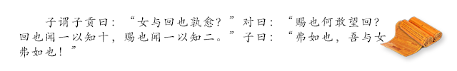 孔子对子贡说:“你和颜回相比,个强一些?”子贡回答说:“我怎么敢和颜回相比呢?颜回他听到一件事就可以推知十件事;我呢,听到一件事,只能推知两件事。”孔子说:“赶不上他,我和你都赶不上他。”