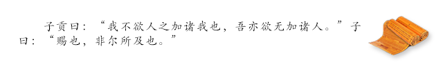 而“吾亦欲无加诸人”的意思是“强加到我头上我不愿意做的事情,不去强加于人”,这句话与孔子的“己所不欲,勿施于人”是一个意思。在孔子的思想体系里,这叫作“恕道”。孔子觉得,子贡勉强能把握“恕道”离“仁道”还有着巨大差距。