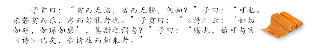 子贡说:“贫穷却不巴结奉承,富贵却不骄傲自大,怎么样?孔子说:“可以了,但还是不如虽贫穷却乐于道,虽富贵却谦虚好礼。”子贡说:“《诗经》上说:.要像骨、角、象牙、玉石等的加工一样,先开料,再粗锉,细刻,然宕磨光后那就是这样的意思吧?”孔子说:“赐呀,现在可以同你讨论《诗经》了。告诉你以往的事,你能因此而知道未来的事。”