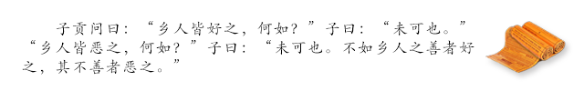 子贡问道:“乡里人都喜欢他,这个人怎么样?”孔子说:“还不行。”“乡里人都厌恶他,这个人怎么样?”孔子说:“还不行。最好是乡里的好人都喜欢他,乡里的坏人都厌恶他。”