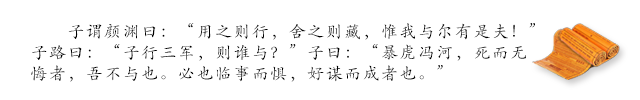 孔子对颜渊说:“如果用我,就去积极行动;如果不用我,就藏起来。只有我和你才能这样吧?”子路说:“如果让您率领三军,您愿找谁一起共事呢?”孔子说:'赤手空拳和老虎搏斗,徒步涉水过大河,即使这样死了都不后悔的人,我是不会与他共事的。我所要找的共事的人,一定是事谨慎小心,善于谋划而且能完成任务的人。”