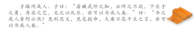子路问怎样做才是一个完美的人。孔子说:“如果具有臧武仲的智慧,孟公绰的克制,卞庄子的勇敢,冉求那样多才多艺,再用礼乐加以修饰,也就可以算是一个完人了。”孔子又说:“现在的完人何必一定要这样呢?见到财利想到义的要求,遇到危险能献出生命,长久处于穷困还不忘平日的诺言,这样也可以成为一位完美的人。”