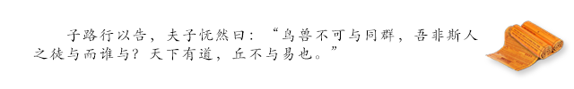 子路回来告诉孔子,孔子失望地说:“人不能和鸟兽同群,我们不同人打交道同谁打交道?如果天下太平,我就用不着同你们一道来从事改革了。”