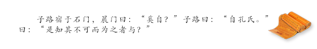 子路在石门住宿了一夜。早上守城门的人说:“从哪儿来?”子路说:“从孔子家来。”门人说:“就是那位知道做不成却还要做的人吗?”