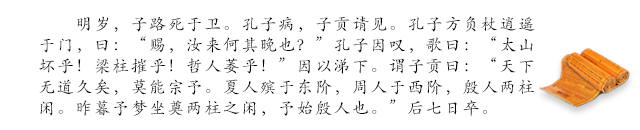 第二年,子路死在卫国。当时孔子也正生病,子贡来看孔子。孔子正拄着拐杖在门外悠闲散心,他一见子贡就说:“端木赐,你来得为什么这么晚啊?”随即他感慨地唱道:“泰山崩塌了!梁柱折断了!哲人要死了!“随着歌声他的眼泪也往下流。接着他又对子贡说:”天下无道已经很久了,没有一个人尊重我的主张。夏朝人死了,灵柩是停在东面的台阶上;周朝人死了,灵柩是停在西面的台阶上;殷朝人死了,灵柩是停在正堂两根柱子的中间。昨天晚上我梦见自己坐在正堂两根柱子的中间享受祭奠,我本来就是殷朝人的后代啊。“七天以后孔子就去世了。