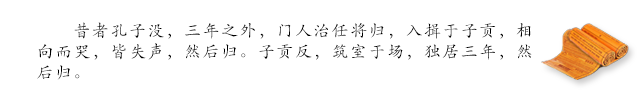 从前,孔子逝世,(弟子们服丧)三年后,收拾行李将要各自回去,走进子贡住处行礼告别,相对痛哭,泣不成声,这才回去。子贡又回到墓地,在祭场上搭了间房子,独居三年,然后才回家。