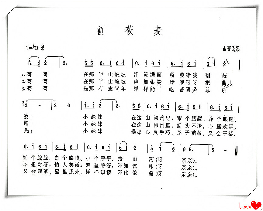 《割莜麦》是产生于山西神池的一首山歌,它以开阔悠长的音调,不但为我们展示了一幅农村青年男女共同劳动的场面,也引申揭示了他们在劳动中建立起来的纯洁爱情。