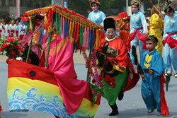 《跑旱船》这首民歌多在春节期间的歌舞中演唱,歌词描绘了歌舞表演者扮成当地老头和老太太的穿着打扮,表现了观众观看表演时欢悦好奇的神态,充满幽默诙谐的情趣。