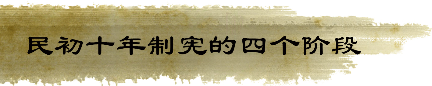 第一阶段是《天坛宪草》的制定;第二阶段是国会的一次复会与《宪草》的续议(1916-1917);第三阶段是南北分裂与西南护法续议(1918-1920);第四也是最后一个阶段是国会二次复会与制宪完成(1922-1923)。