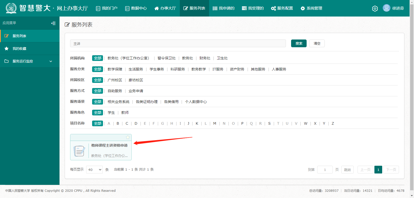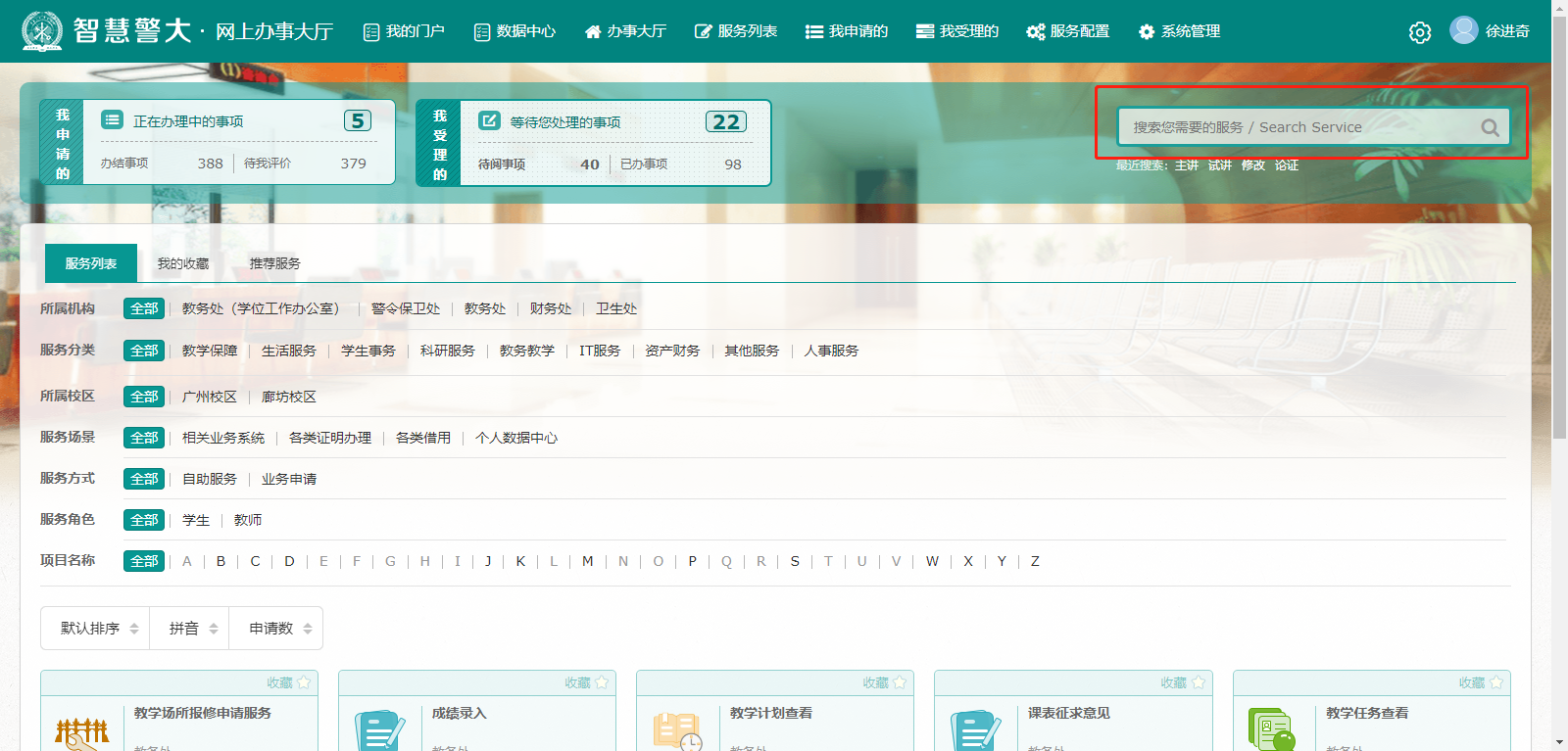 3、进入办事大厅后,点击右上方的搜索框,并以“主讲”为关键词进行搜索,这个步骤加载较慢,请耐心等待。