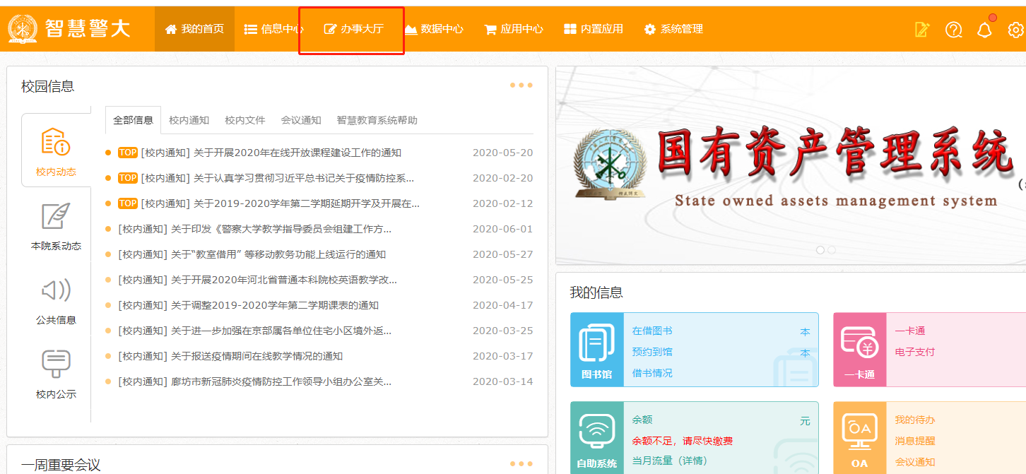 2、进入智慧警大主页后点击办事大厅选项,如下图: