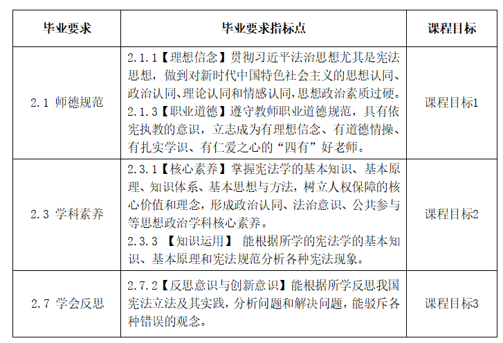 2.学科素养:通过对宪法学课程的学习,帮助学生系统掌握宪法的基本知识、基本原理、知识体系、基本思想与方法,并能用它们分析各种宪法现象,在实践中历练宪政思维,树立依宪治国和人权保护的观念,形成思想政治学科的核心素养。(支撑毕业要求2.3)。