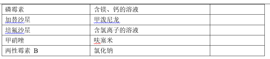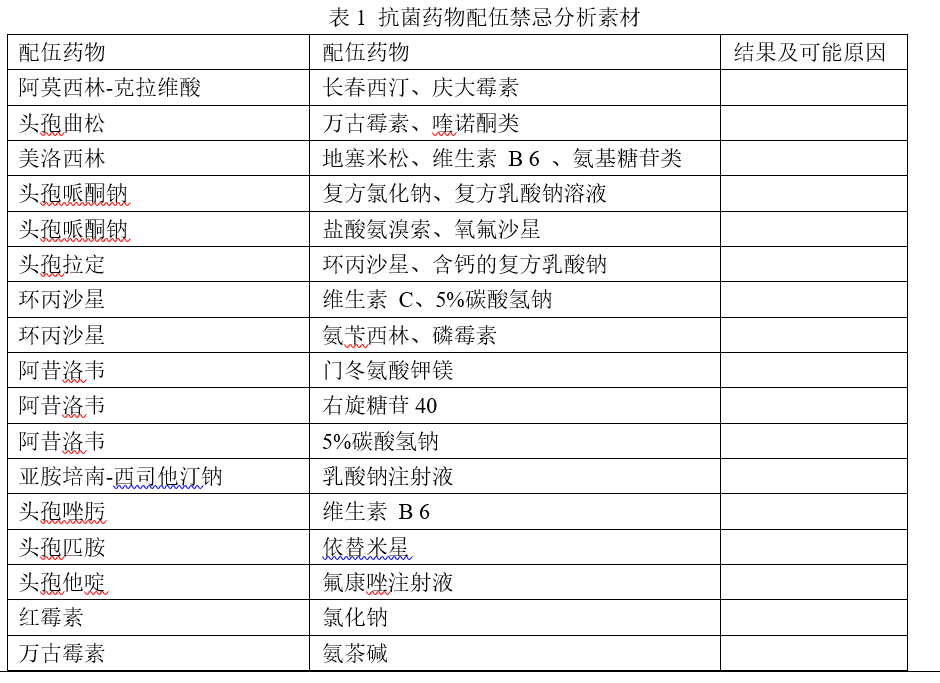 配伍禁忌技能训练2:提供学生资料,让学生查询相关资料后,分析抗菌药物的配伍禁忌。