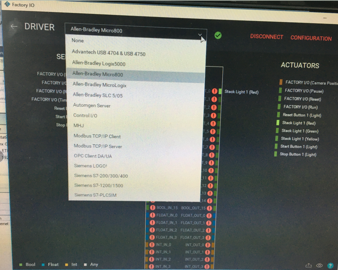 在Factory IO菜单栏FILE下的Drivers中进行设备选择,