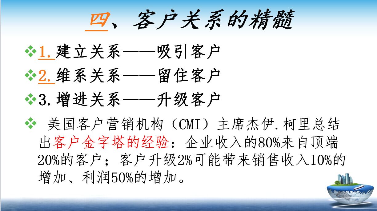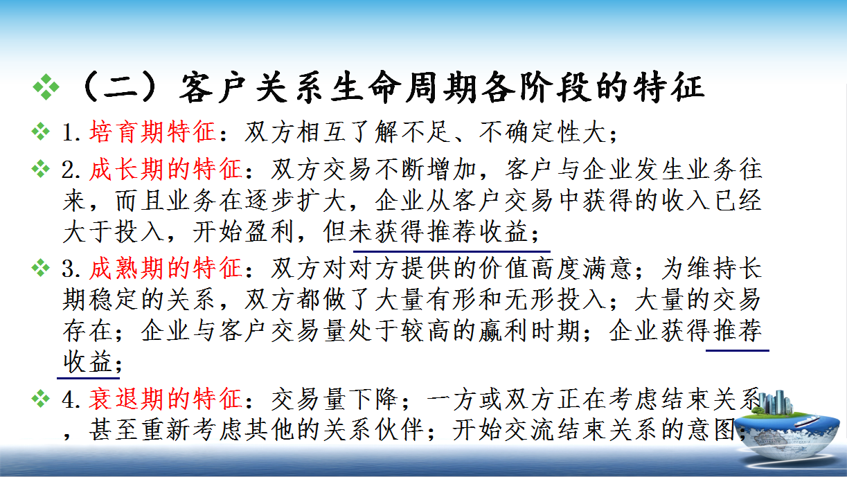 4.能动型:销售完成后,企业不断联系客户提供有关改进产品的建议和新产品的信息;