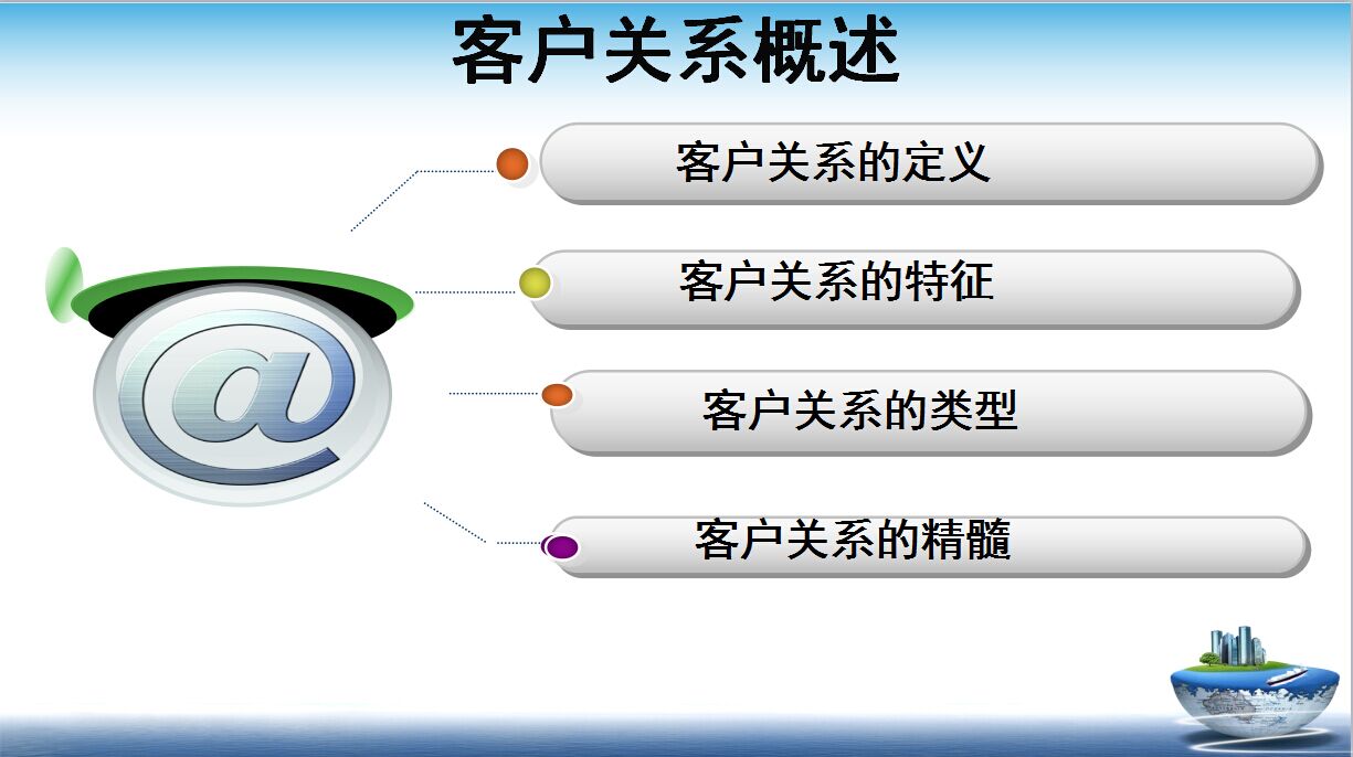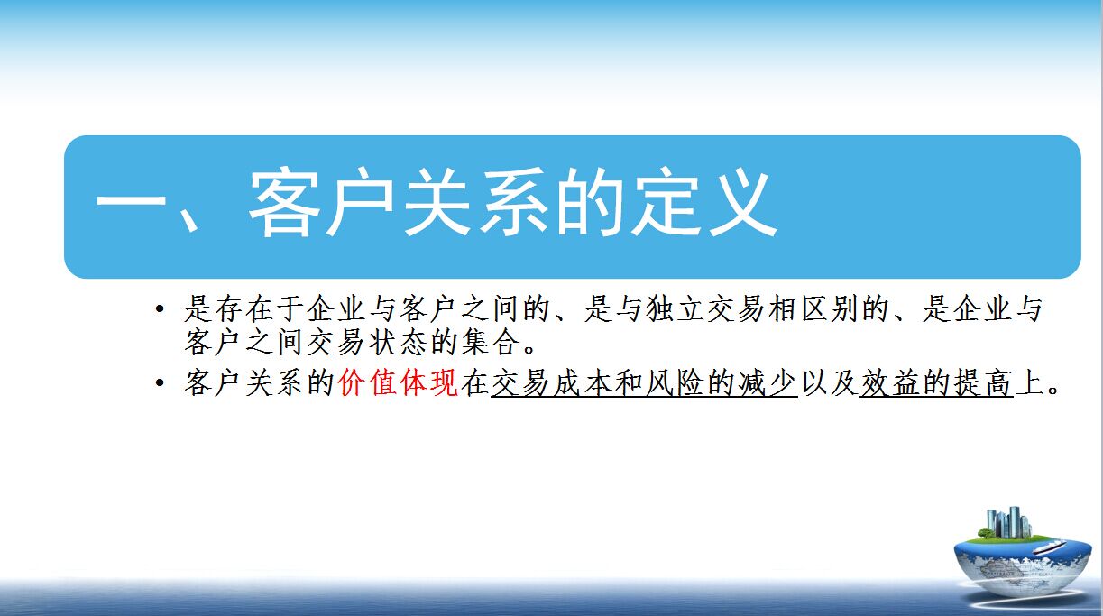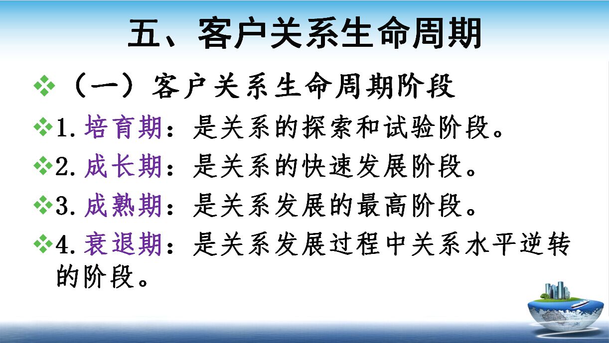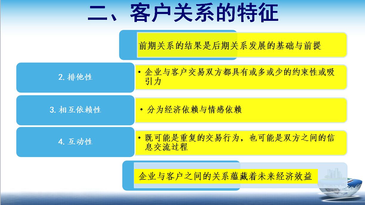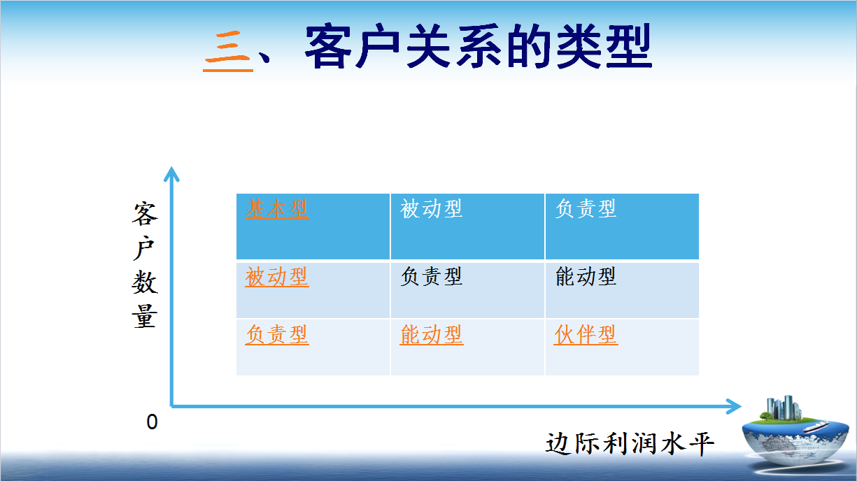 5.伙伴型:企业不断地协同客户努力,帮助客户解决问题,支持客户的建议,实现共同发展。