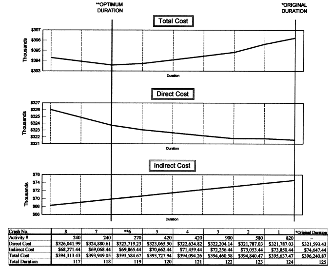 Indirect costs are not as easy to visualize.They include home office and field office Overhead. They are necessary to supervise and support the job site. Examples are the rental of the job-site trailer; the superintendent’s salary; and the cost of security fencing, guard, and signs. indirect costs are a factor of the project’s duration and the degree of supervision required. If a project increases in length or requires a high level of coordination, the indirect costs will increase. By minimum cost scheduling, project managers can determine the optimum duration for the project, minimizing the project’s total cost, which equals a project’s direct cost plus its indirect cost.)