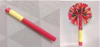 1. 一张正方形的纸对折剪开,用其中一张纸,在扇柄上卷起来粘好(注意不要卷的太紧或者太松,留有可以上下活动的余地就可以了)