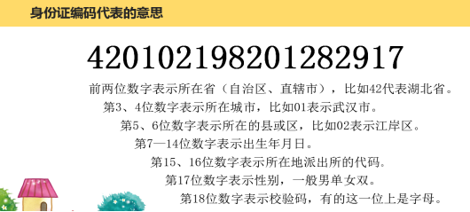 前两位数字表示所在省(自治区、直辖市),比如42代表湖北省;第3、4位数字表示所在城市,比如01表示武汉市;第5、6位数字表示所在的县或区,比如02表示江岸区;第7—14位数字表示出生年月日;第15、16位数字表示所在地派出所的代码;第17位数字表示性别,一般男单女双;第18位数字表示校验码,有的这一位上是字母。