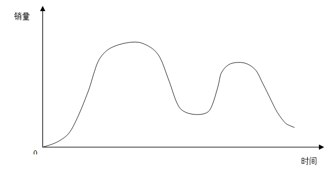 (1)再循环型。有的商品呈现出反复循环的形态,衰退一段时间后,又重新流行起来。在正常情况下,再循环的销售量和持续时间都低于第一个循环周期。如下图7-3所示: