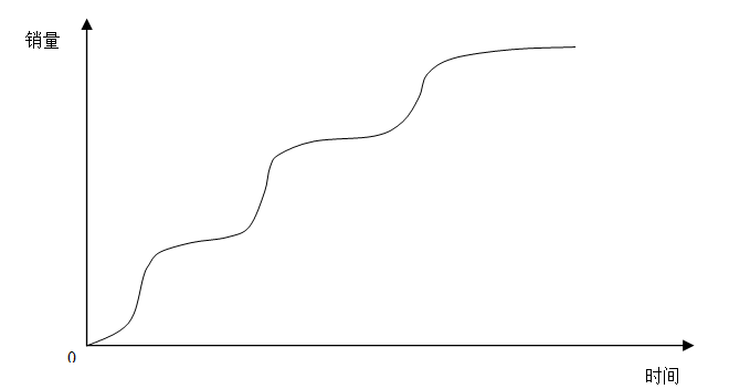 (2)扇型。有的产品进入成熟期后,由于不断的开发新的市场,或其它的有效的营销措施,使得产品越过了衰退期,直接进入下一循环的成长期,使产品的销售量不断地达到新的高潮,如此往复。比如杜邦公司发明了尼龙后,用尼龙生产出降落伞投入市场,在尼龙降落伞的成熟期又推出了尼龙缆绳。此后,在前一个产品进入成熟期时,依次推出尼龙衬衫、尼龙轮胎和尼龙地毯等。每一个新用途的开发都使产品进入了新循环的成长期。扇型产品生命周期曲线如下图7-4所示: