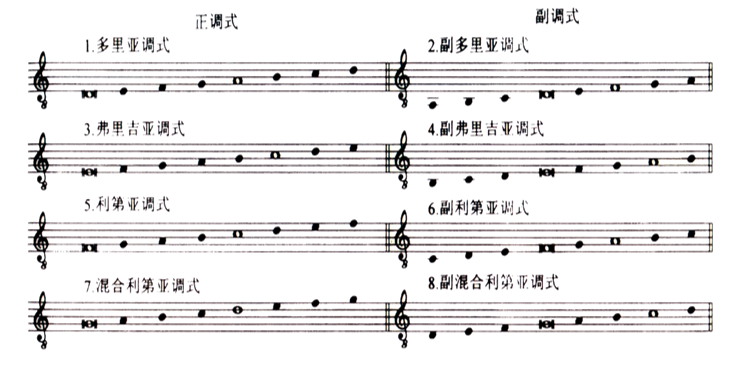 中世纪调式概念与今天的调式意义很不一样,它产生的最初目的是对格里高利圣咏进行整理、归类,因此在当时,它首先是一种旋律的分类理论。11世纪,随着四线谱的发明,教会音乐家们开始把格里高利圣咏的旋律记录下来。在记录并归类整理的过程中他们发现,几乎所有的圣咏都结束在re、mi、fa、sol四个音上,根据这种特征把圣咏旋律分为8种形态——四个正调式和四个副调式,每两个一对,副调式音阶的音域比正调式低四度。