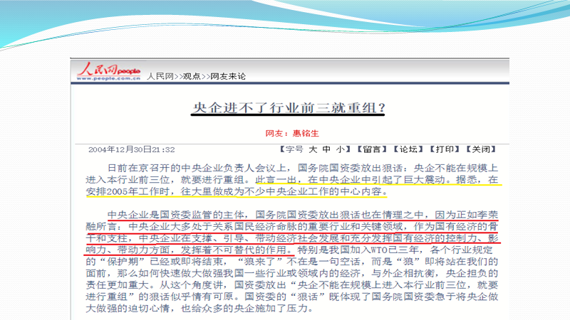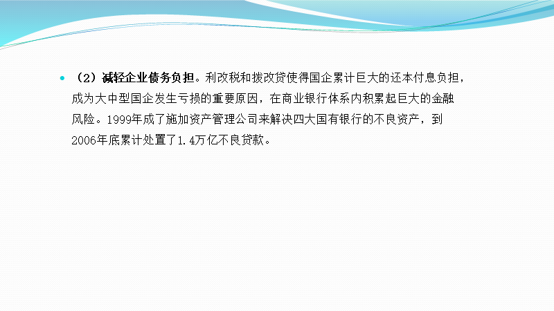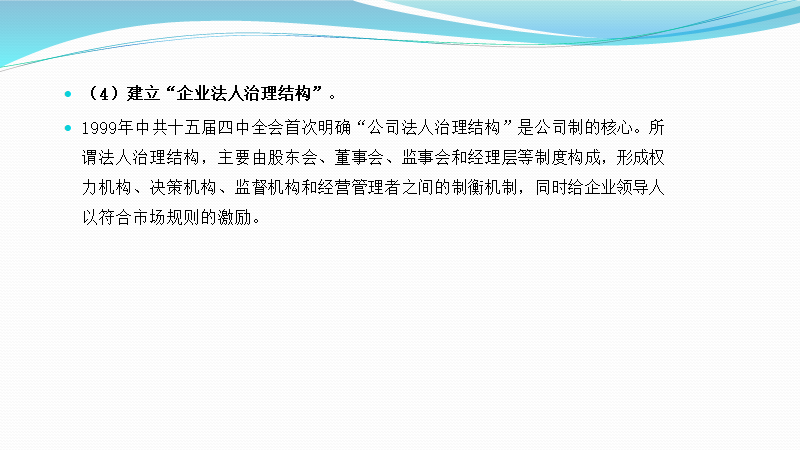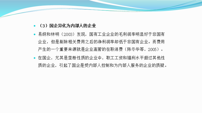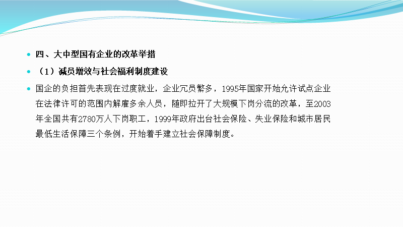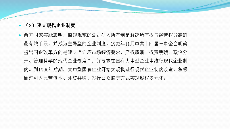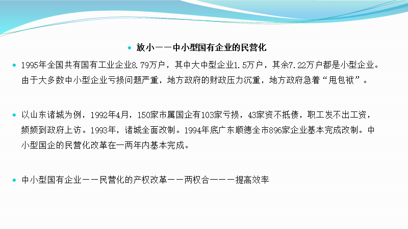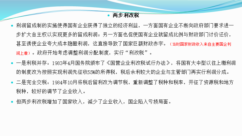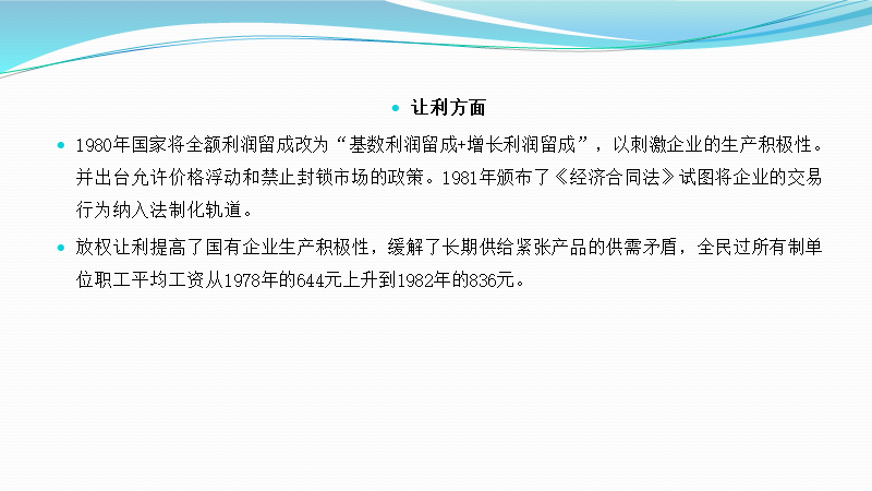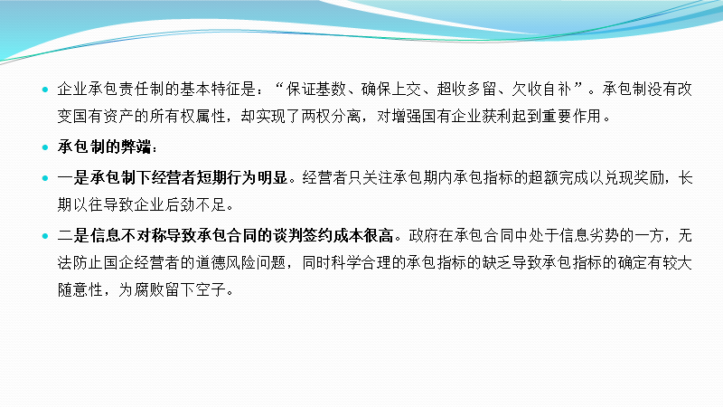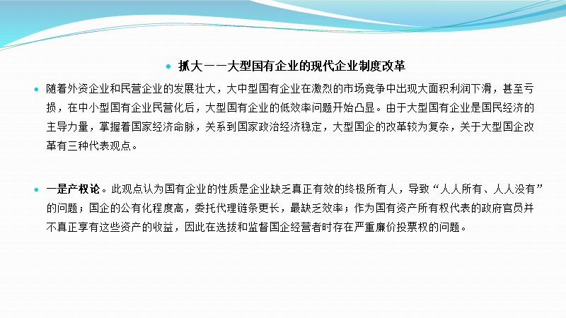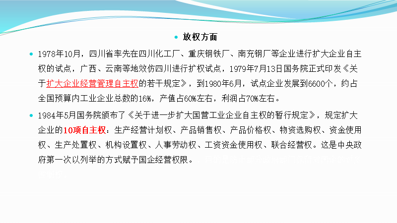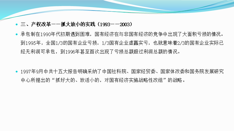 1984年中共十二届三中全会针对计划经济体制下的国有企业弊端做了全面总结:“政企职责不分,条块分割,国家对企业统的过多过死,忽视商品生产、价值规律和市场的作用,分配中平均主义严重。这就造成了企业缺乏应有的自主权,企业吃国家大锅饭,职工吃企业大锅饭的局面,严重压抑了企业和广大职工群众的积极性、主动性、创造性”。