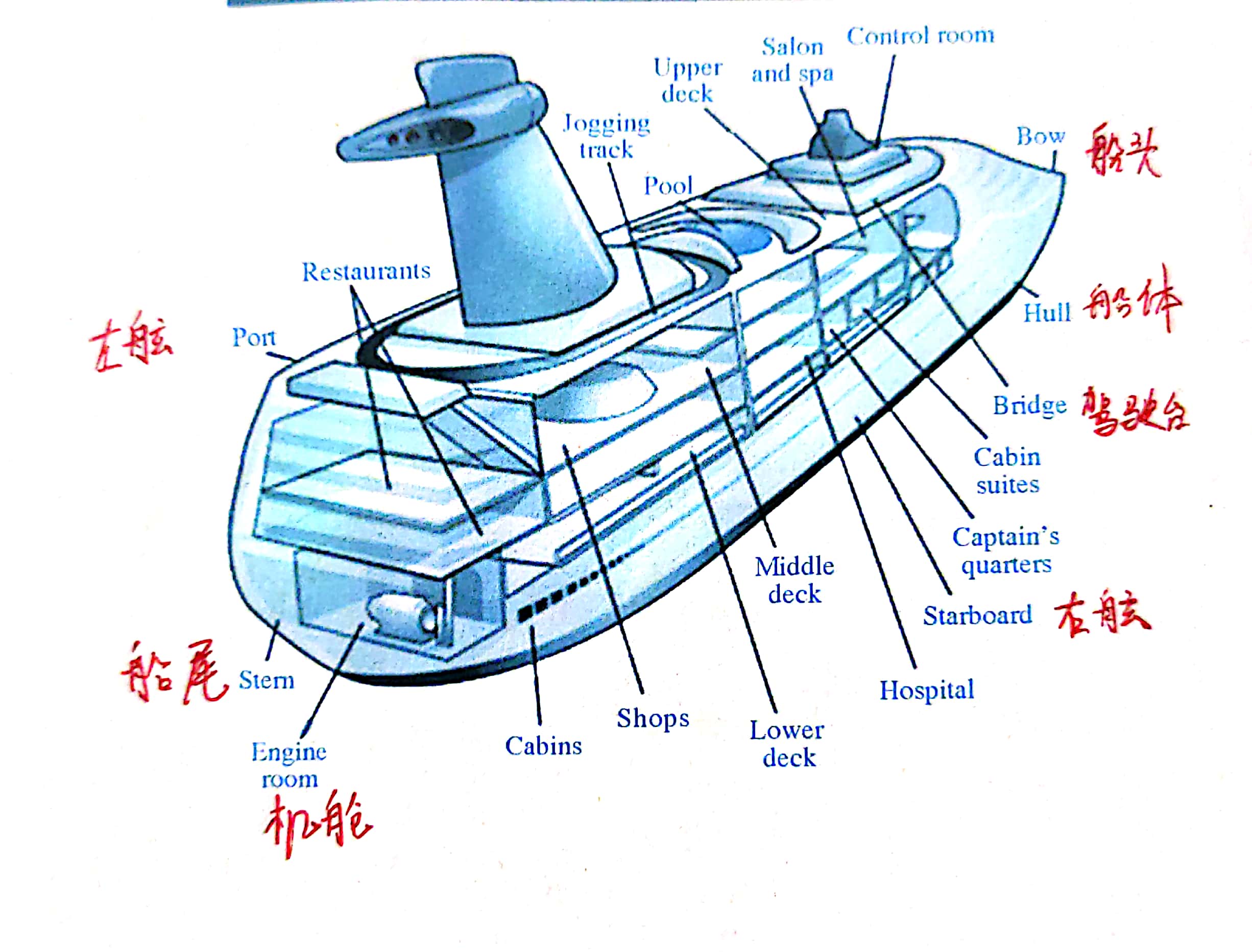 Directions:Listen to the following sentences and write down places on the cruise ship you hear.