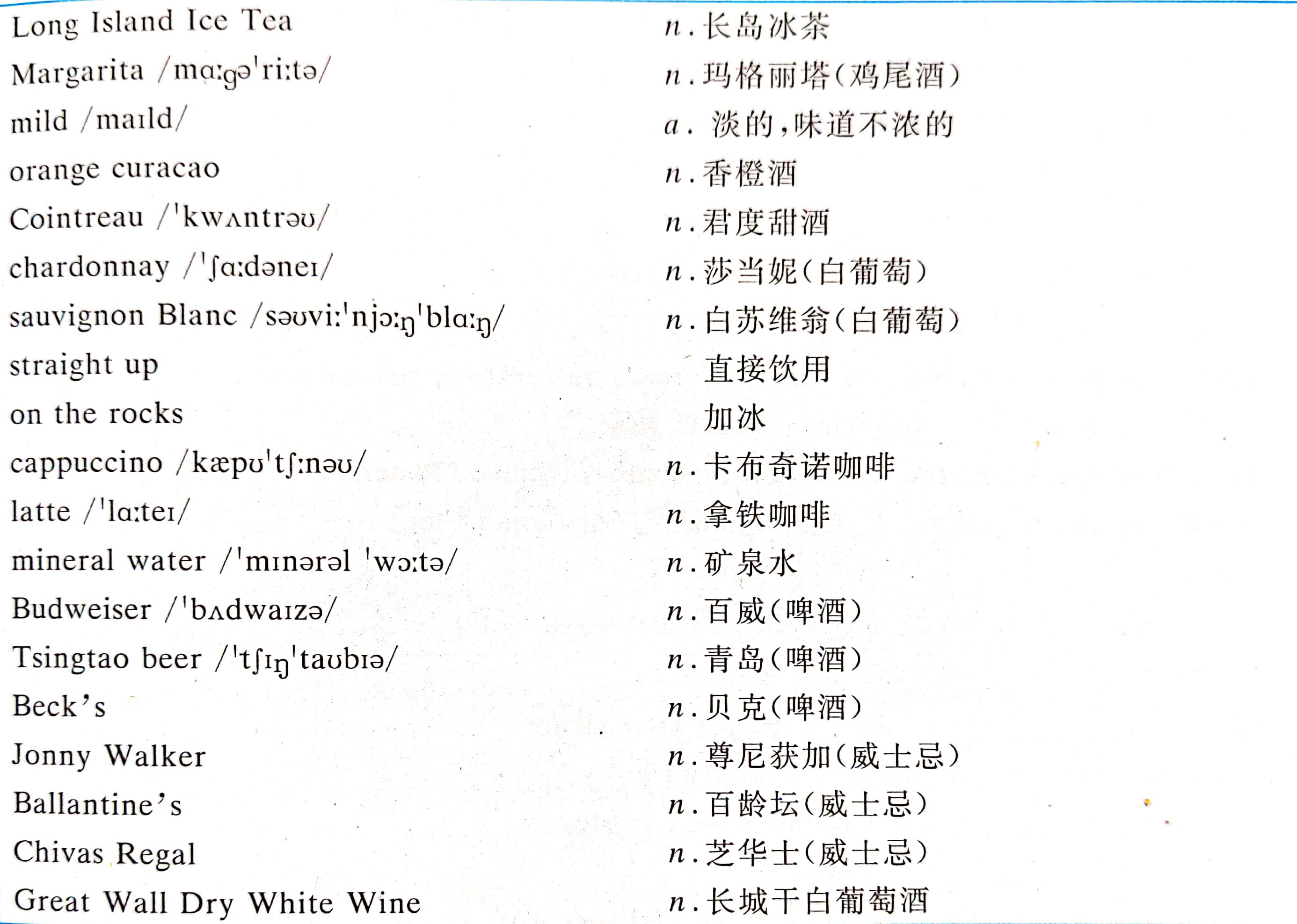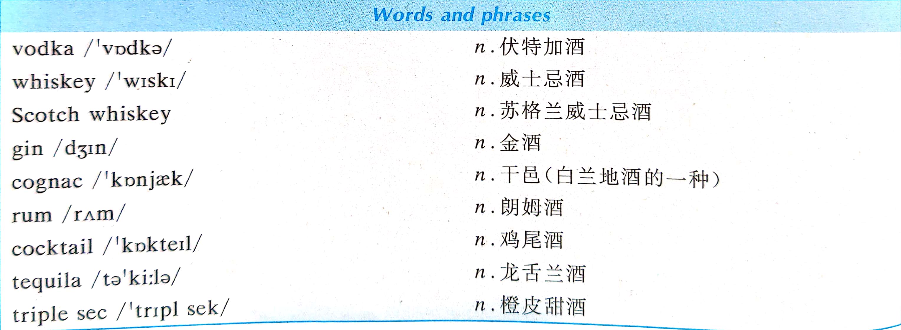 spirit/'spirit/ n.烈酒 soda/'suədə/ n.苏打水 mixer/'miksə/ n.调酒用的饮料 loosen up放松 |