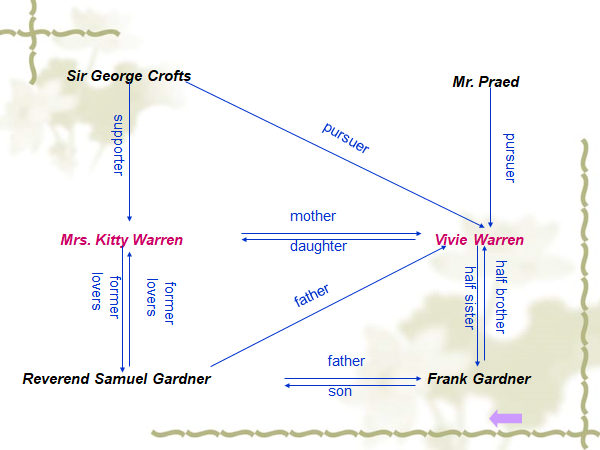 Mrs. Kitty Warren: full of endurance and courage, devoted, domineering (专横的;盛气凌人的 ),self-deception, oppressed and oppresser.