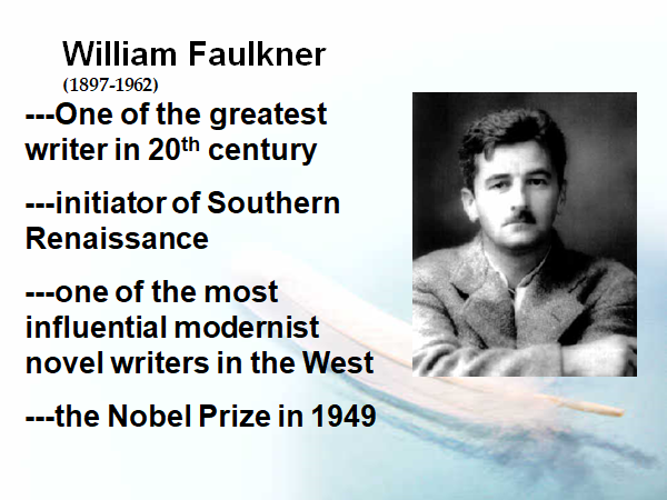 威廉·福克纳(William Faulkner 1897年9月25日-1962年7月6日),美国文学史上最具影响力的作家之一,意识流文学在美国的代表人物,1949年诺贝尔文学奖得主,获奖原因为“因为他对当代美国小说做出了强有力的和艺术上无与伦比的贡献”。