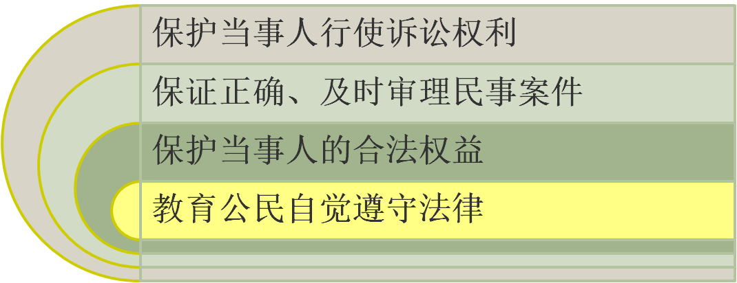 4. 教育公民自觉遵守法律。在解决纠纷的同时,民事诉讼还具有教育功能:通过当事人亲自参与民事案件的审理过程并实际承受裁判的结果,使其深刻体会法律的权威与尊严,从而教育当事人自觉遵守法律;通过公开审理过程和裁判结果,使社会公众认识到守法受褒扬与违法受制裁的后果,从而教育社会公众自觉遵守法律。在作为法院和当事人的诉讼行为准则的同时,民事诉讼法也将落实民事诉讼的教育功能作为基本任务。因此,教育公民自觉遵守法律是民事诉讼法的任务之一。