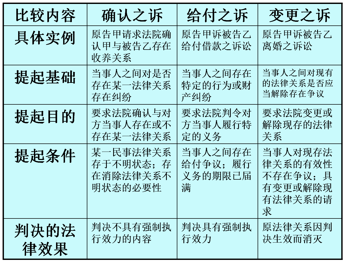 三者相互联系:确认之诉与给付之诉、变更之诉与给付之诉常常并存于同一个诉讼案件之中,确认之诉与变更之诉的肯定判决对给付之诉具有预决的效力。