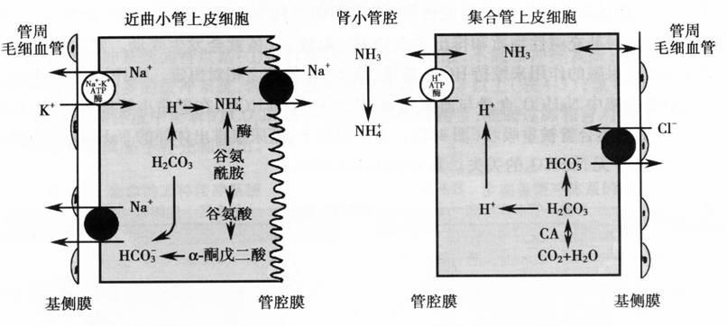 3. 产NH3和铵盐(NH4+)的排出 正常情况下,NH4+的排泄速率为20~40mmol/d,当尿液pH稍有下降,肾小管上皮细胞则分泌NH3来阻止尿液pH的下降,因此NH4+的生成和排出是pH依赖性的,且机体酸中毒程度越严重,尿NH4+排出量越多,甚至能增加到10倍以上。近曲小管上皮细胞是产 NH3的主要场所,主要由谷氨酰胺酶水解谷氨酰胺产生,酸中毒时,谷氨酰胺酶活性增强,以下反应加速进行。谷氨酰胺在谷氨酰胺酶作用下水解产生氨(NH3)和谷氨酸,谷氨酸脱NH3生成α-酮成二酸,后者进一步代谢生成HCO3-。酸中毒越严重,谷氨酰胺酶活性越高,产生NH3和HCO3- 越多。HCO3-与Na+同向转运进入血循环。在近曲小管NH3与细胞内碳酸解离的H+结合成NH4+,通过NH4+-Na+交换进入肾小管管腔,随尿排出。NH3是脂溶性,远曲小管和集合管泌NH3,可通过小管上皮细胞膜自由扩散进入小管腔,和尿液中H+结合成NH4+,从尿中排泄(图4-3) ;也可通过基侧膜进入细胞间隙。酸中毒严重时,远曲小管和集合管磷酸盐缓冲系统不能缓冲时,不仅近曲小管泌NH4+增加,远曲小管和集合管泌NH3也增加,弥散至管腔与H+结合成NH4+,随尿排出体外。管腔中NH4+的不断形成维持了管腔内外H+的浓度梯度,促进H+的持续分泌,是机体在严重酸中毒情况下排H+的补充过程。